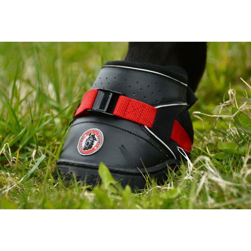 Das elastische Design unterstützt die natürliche Funktion des Hufes. Der Huf kann leicht in die flexible Gummisohle einsinken, wodurch der Bodenkontakt erhalten bleibt und die Durchblutung gefördert wird.