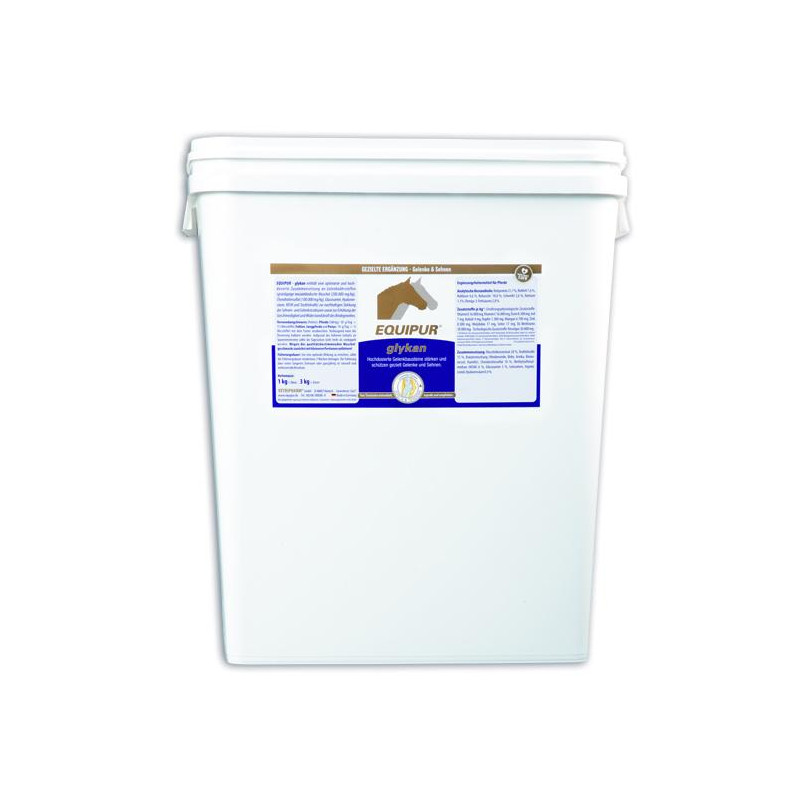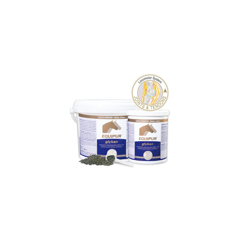EQUIPUR - glykan enthält eine optimierte und hochdosierte Zusammensetzung an Gelenknährstoffen (grünlippige neuseeländische Muschel (200.000 mg/kg), Chondroitinsulfat (100.000 mg/kg), Glucosamin, Hyaluronsäure, MSM und Teufelskralle) zur nachhaltigen Stärkung der Sehnen- und Gelenkstrukturen sowie zur Erhöhung der Geschmeidigkeit und Widerstandskraft des Bindegewebes.