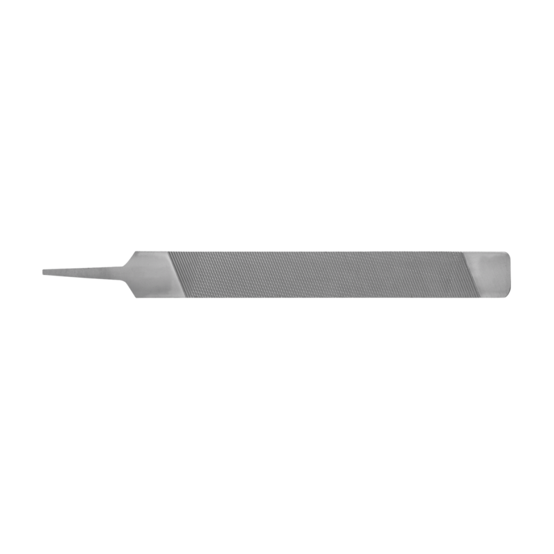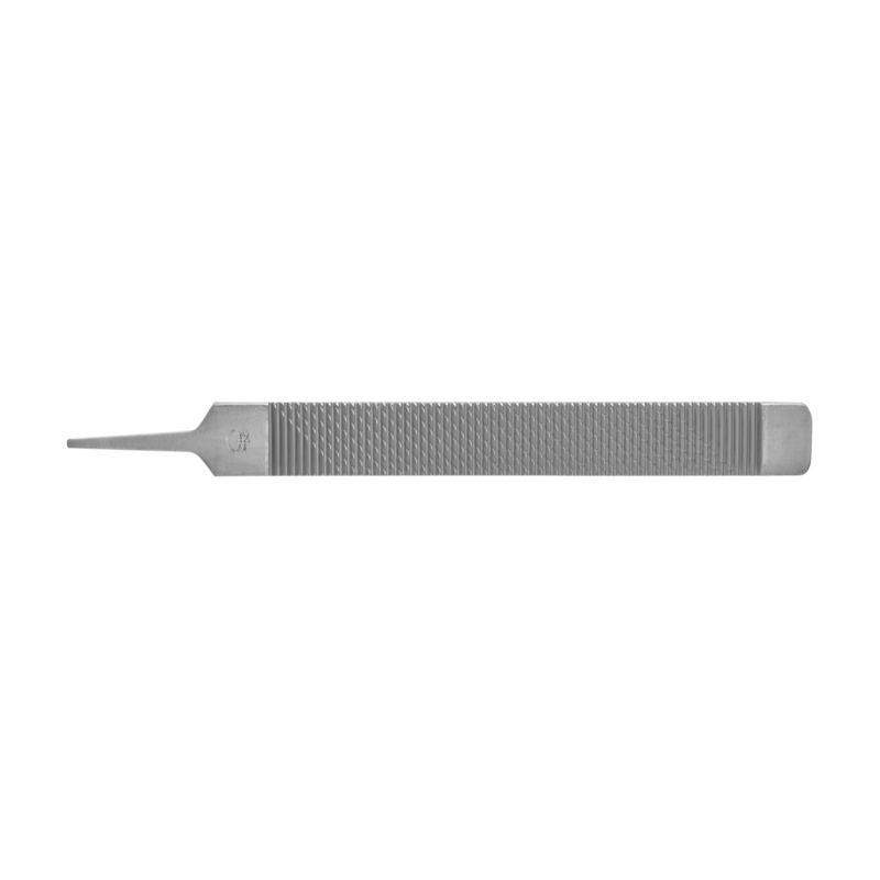Rechteckige Feile mit Angel und Zahnung auf vier Seiten. Eine Seite fein, eine Seite grob.
